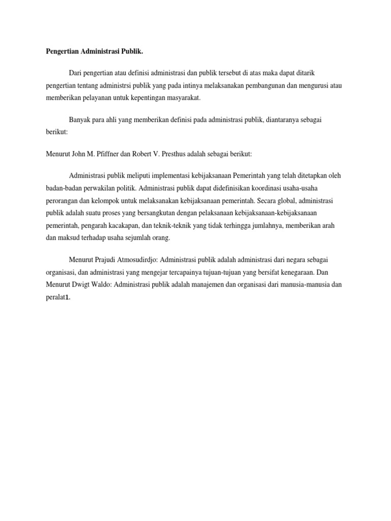 Untuk meningkatkan pelayanan publik yang demokratis, konsep the new public perbandingan. Penyusunan, pengimplementasian dan pengevaluasian kebijakan. Administrasi publik yaitu sebuah upaya penyusunan dan pelaksanaan kebijakan yang dilakukan oleh birokrasi dalam sekala besar untuk kemudian beralifiasi pada kepentingan publik (masyarakat), yang pada intinya arti ini di dapatkan untuk kepentingan masyarakat. Dalam hal ini, mendefinisikan administrasi publik dalm 18 definisi berdasarkan empat kategori: Public administration) atau administrasi negara adalah suatu bahasan ilmu sosial yang mempelajari tiga elemen penting kehidupan bernegara yang meliputi lembaga legislatif, yudikatif.