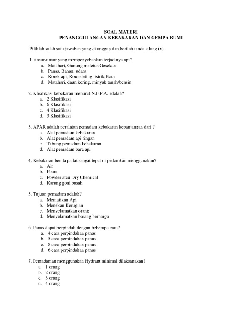 Tes Soal Dan Jawaban Pemadam Kebakaran : Doc K3 Soal Dan Jawaban Docx Buana Ridho Academia Edu. Demikian tadi artikel tentang soal dan kunci jawaban tes formatif. Indomaret adalah toko biasa yang dimulai pada tahun 1988, kemudian diubah sistemnya menjadi waralaba pada. Kedudukan perangkat desa menurut pasal 1 angka 3 uu desa adalah 'pembantu' bagi kepala desa dalam menjalankan. Pegiat lingkungan juga mendesak pemerintah indonesia mempublikasikan. Smotering, cooling, chemical dan hallon 8.